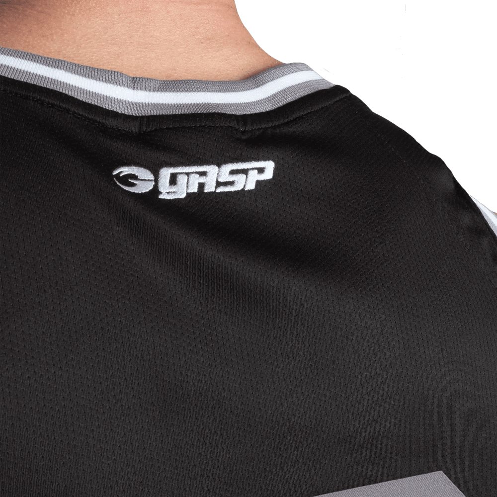 Constructed in micro mesh with great ventilation. Features side panels, large GASP 89 front application, 89 back application, GASP embroidered center back neck, “No Excuses” print at the back hem, and a woven label at hem.