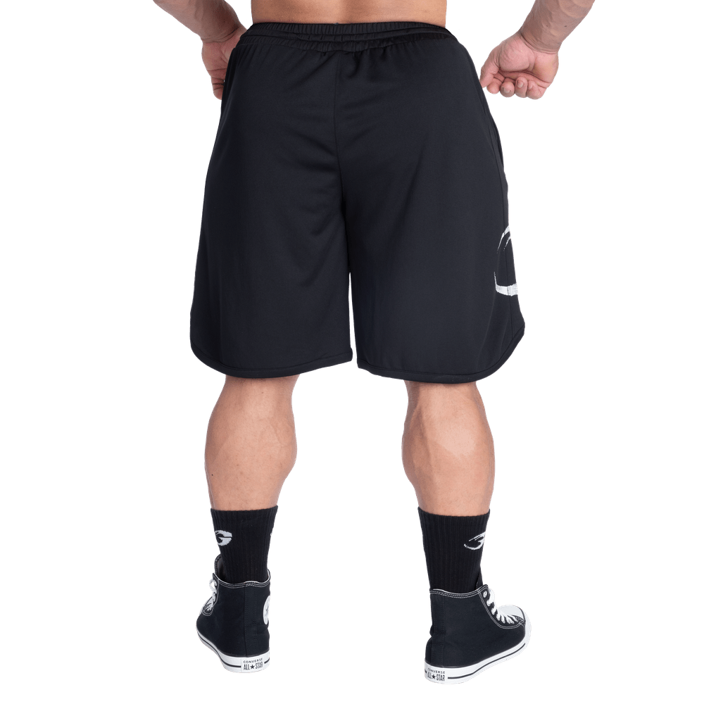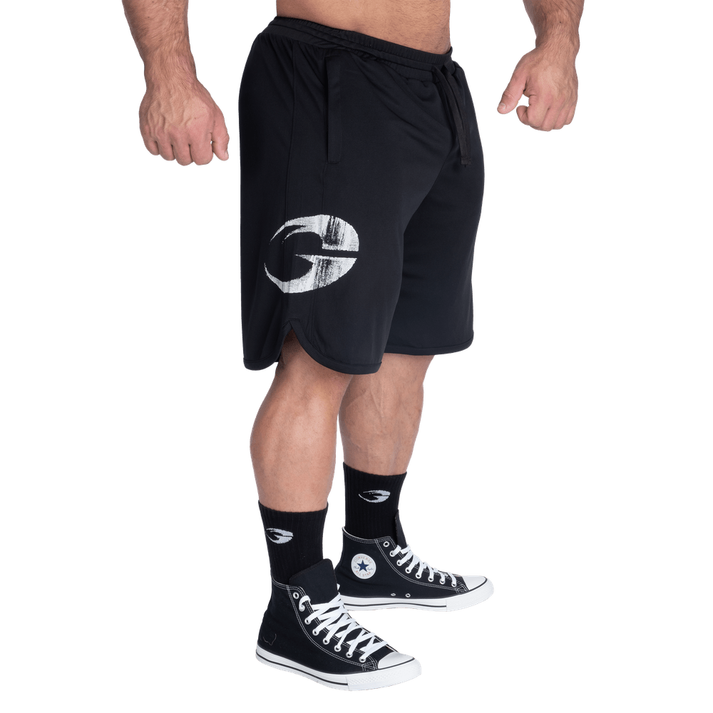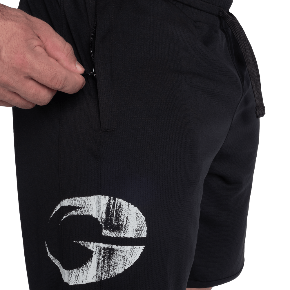 Features: Zippers at pocket, Breathable mesh fabric, panels along outside of legs, prints on both right hip and left side, drawstring for adjustable waist.