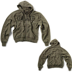 The raw look is very significant for this hoodie, raw edges all over and a huge GASP application on the chest.