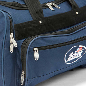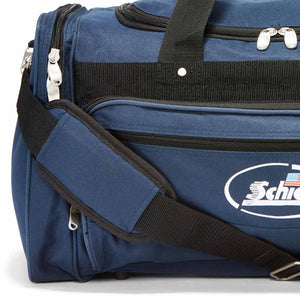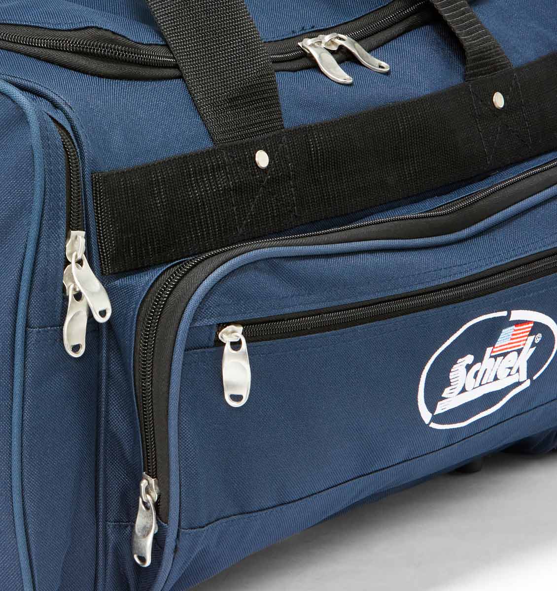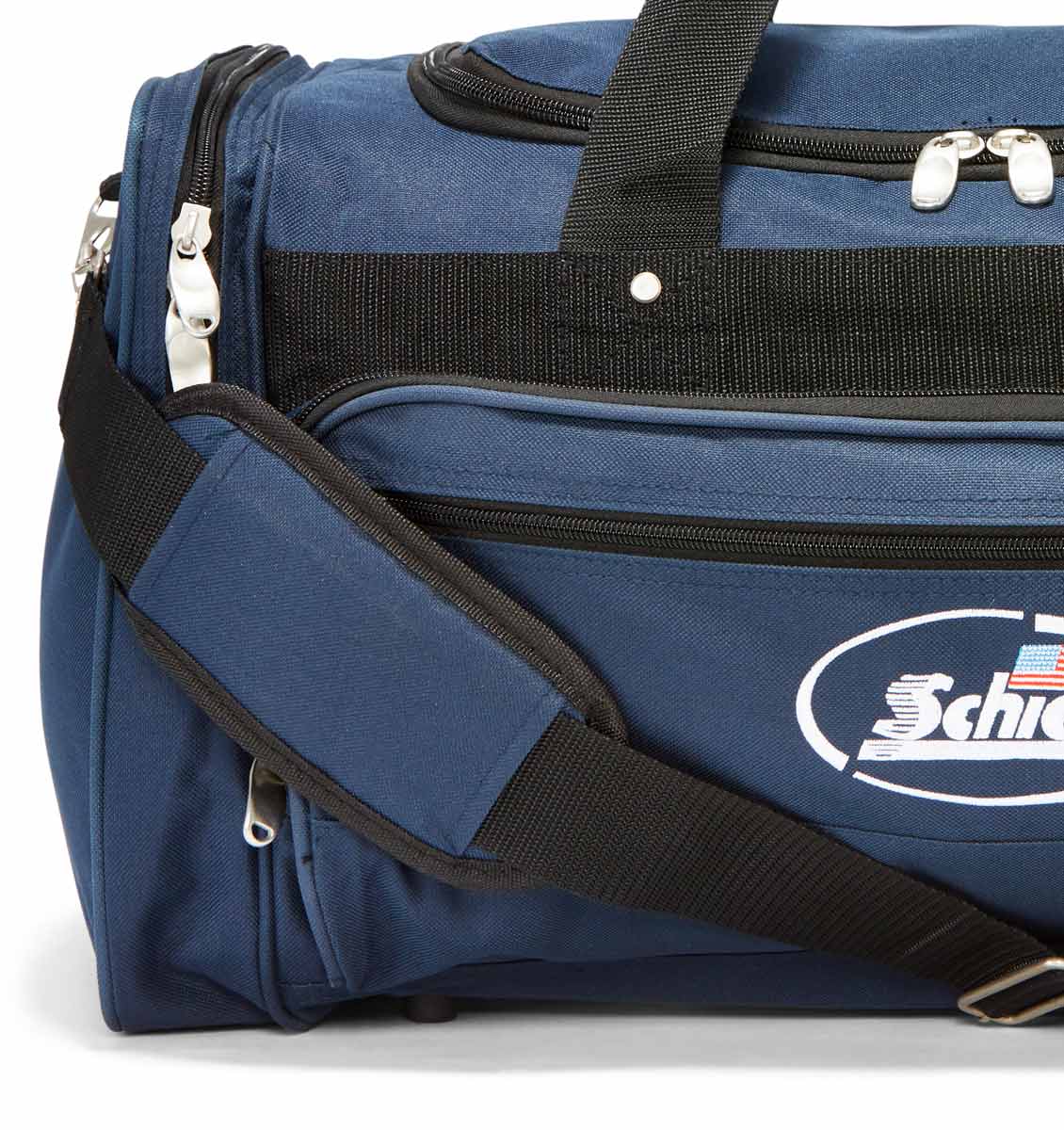 The Deluxe Nylon Gym Bag for carrying all your Schiek gear. The bag measures 22" x 10" x 12". The durable bag has multiple compartments on the front and sides. Available in Black or Navy Blue.